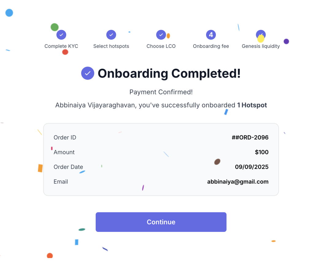 Once your payment is processed, you’ll see an onboarding completion message. Click continue to proceed to enroll in Dabba Genesis Liquidity Program.