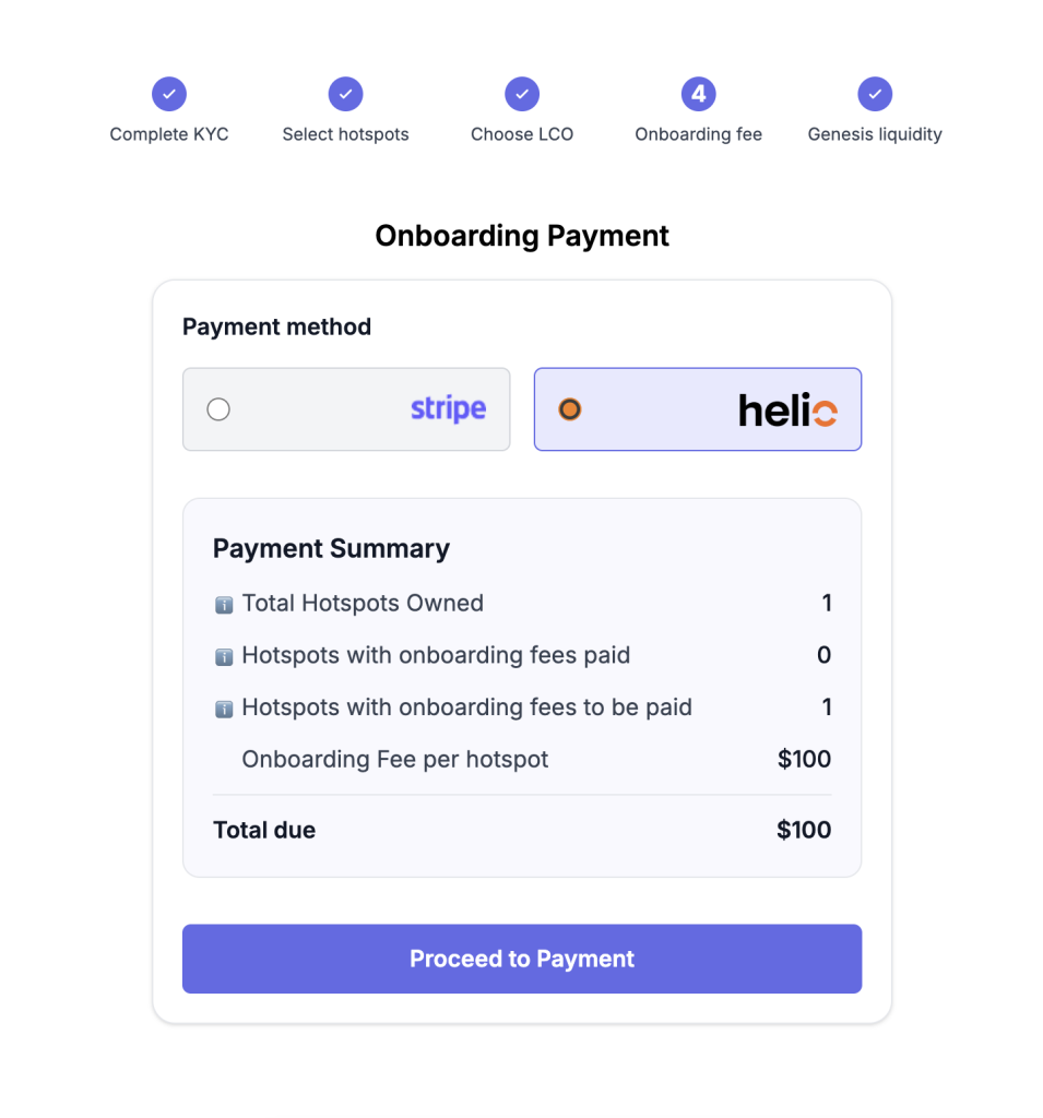 Check your number of hotspots and amount to pay. You can select either Stripe or Helio for your payment processing.